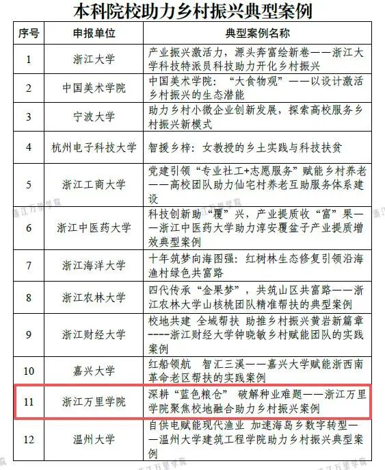 2025年10月,浙江省教育厅公布第四届高校助力乡村振兴典型案例评选结果,浙江万里学院申报的《深耕 “蓝色粮仓” 破解种业难题 —— 浙江万里学院聚焦校地融合助力乡村振兴案例》成功入选本科院校类典型案例。